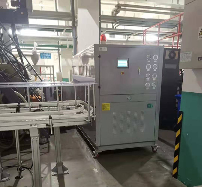 1、 瓶胚口的冷卻:在瓶胚預熱階段,瓶坯(胚)通過紅外線高溫燈管照射,坯(胚)體部分加熱軟化,為了保持瓶口形狀,瓶坯(胚)口是不需要加熱的,因此需要吹塑冷水機(吹塑機冷水機)對其進行冷卻操作;